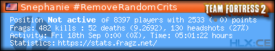 | 1 | Snephanie #RemoveRandomCrits | 0d 01:16:34h | 2020-09-18 00:44:39 | 26 | 8 | 3.25 | 5 | 0.19 | 0 | 30.3% |